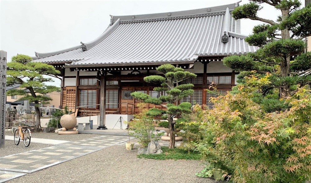 東名高速道路焼津インター近く、焼津さかなセンター等の商業施設や住宅に囲まれた地域にある明るいお寺。