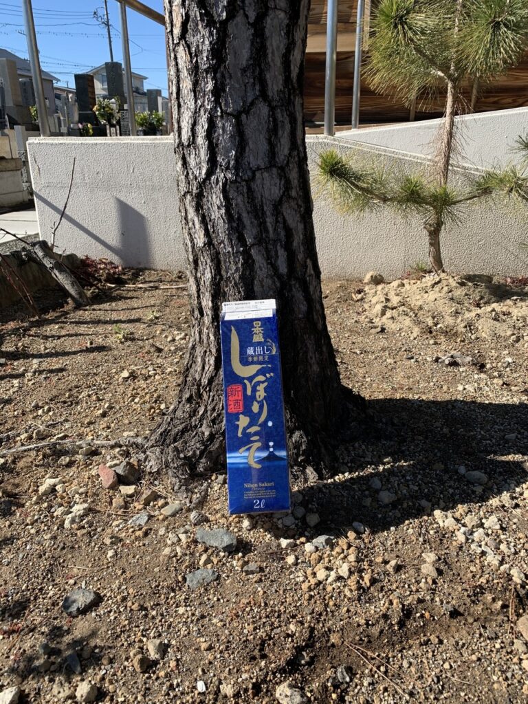 今回、消毒の後に松が元気になるように日本酒を2リットル周りに撒くように言われました。