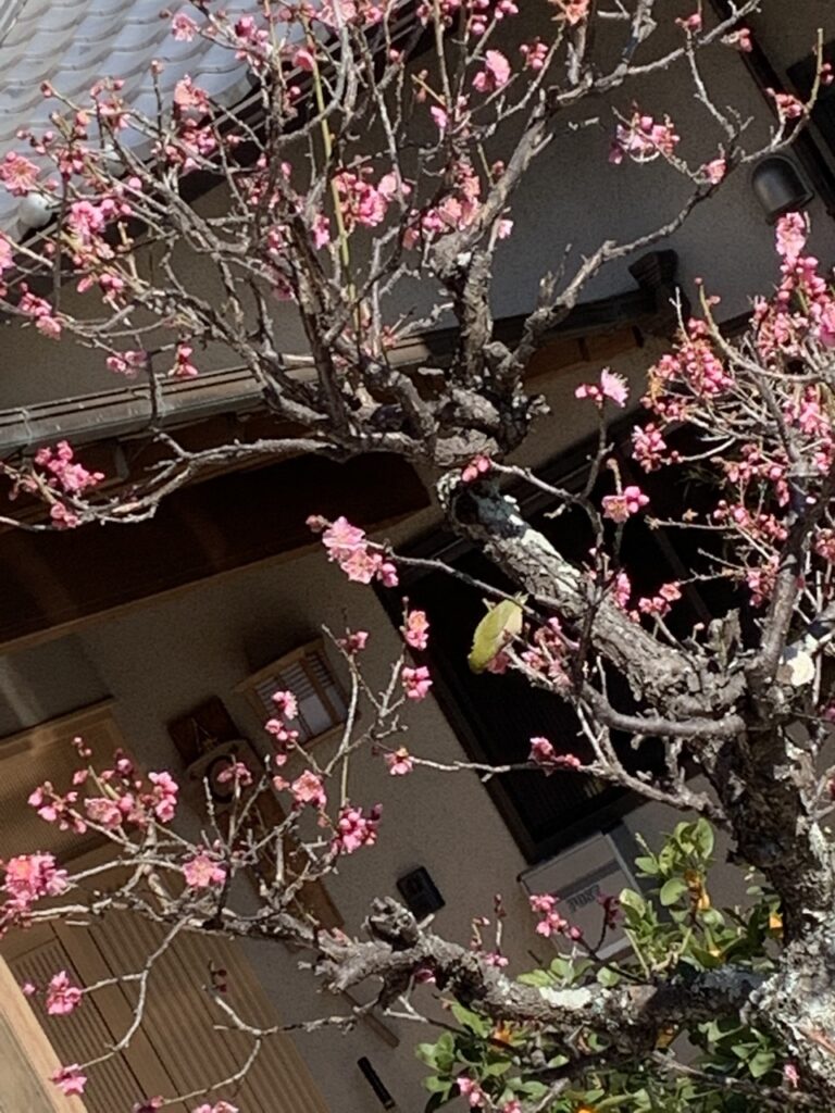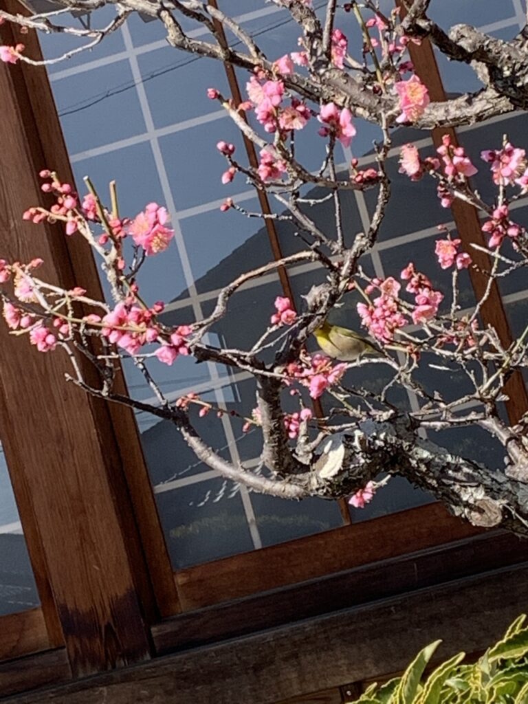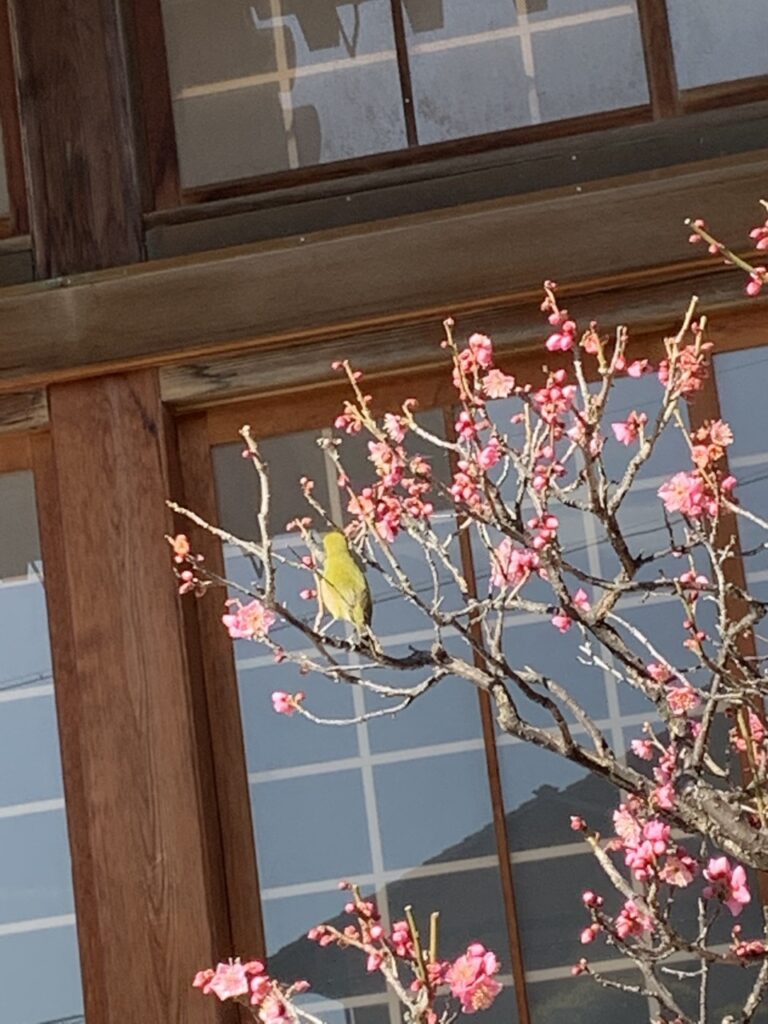 玄関近くの梅の木に鳥を見つけました。
