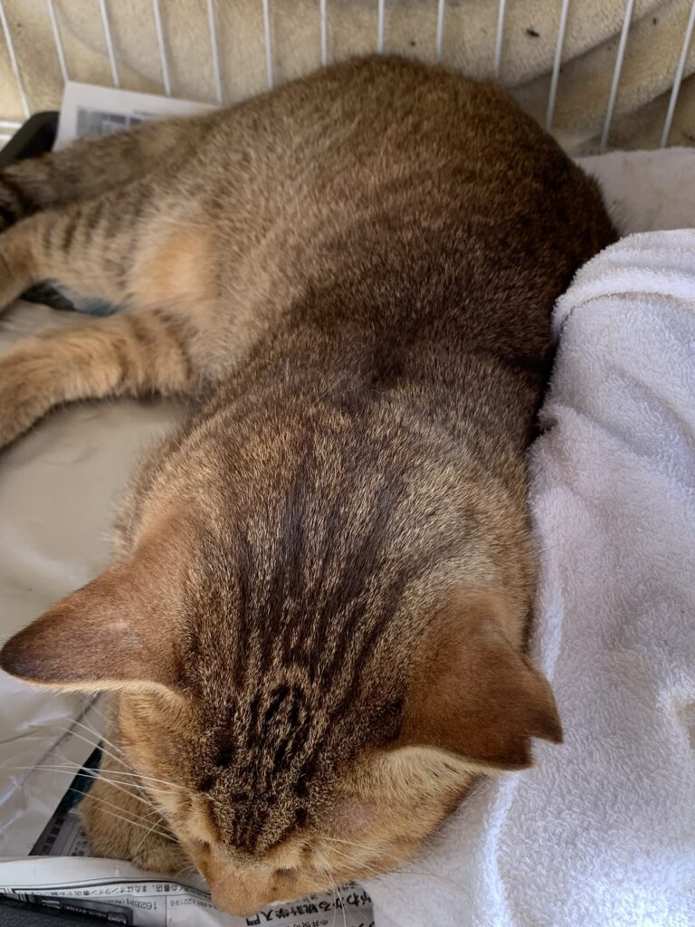 山根は暑いので保冷剤をタオルでまいた上で寝ています。