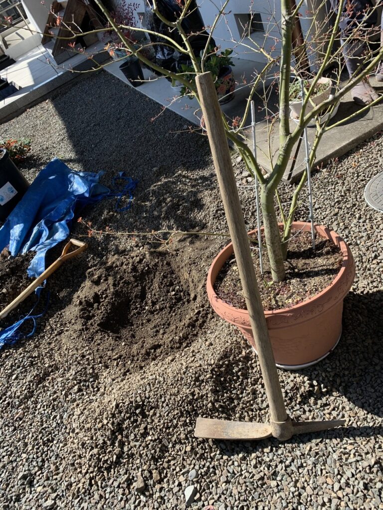 もみじの鉢植えを3っつ、地面に植え替えるためです。