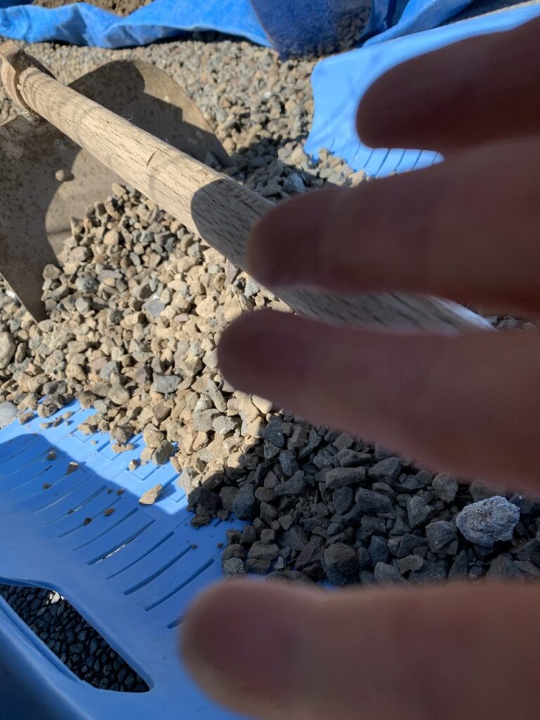 私は土の上の砂利をどかして多い分を境内の砂利が流れてしまったところに運ぶ作業をしました。