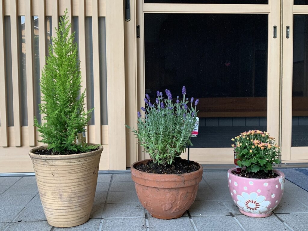 左からゴールドクレスト、ラベンダーのセンティヴィア、菊のマムです。